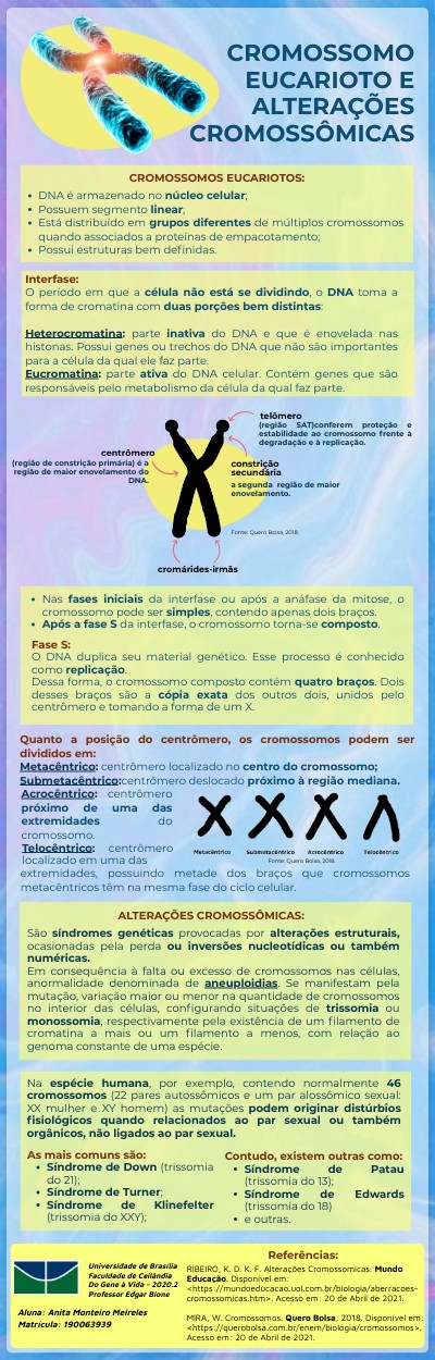 RIBEIRO, K. D. K. F. Alterações Cromossomicas. Mundo Educação. Disponível em:<https://mundoeducacao.uol.com.br/biologia/aberracoes-cromossomicas.htm>. Acesso em: 20 de Abril de 2021. MIRA, W. Cromossomos. Quero Bolsa, 2018. Disponível em: <https://querobolsa.com.br/enem/biologia/cromossomos>. Acesso em: 20 de Abril de 2021.
