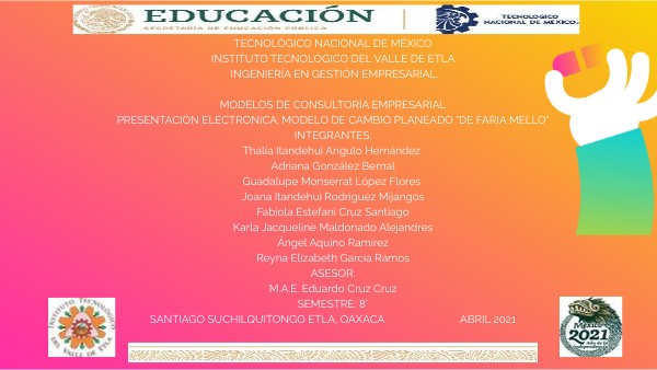 TECNOLÓGICO NACIONAL DE MÉXICO INSTITUTO TECNOLÓGICO DEL VALLE DE ETLA INGENIERÍA EN GESTIÓN EMPRESARIAL. MODELOS DE CONSULTORÍA EMPRESARIAL PRESENTACIÓN ELECTRONICA: MODELO DE CAMBIO PLANEADO "DE FARIA MELLO" INTEGRANTES: Thalía Itandehui Angulo Hernández Adriana González Bernal Guadalupe Monserrat López Flores Joana Itandehui Rodríguez Mijangos Fabiola Estefani Cruz Santiago Karla Jacqueline Maldonado Alejandres Ángel Aquino Ramírez Reyna Elizabeth García Ramos ASESOR: M.A.E. Eduardo Cruz Cruz SEMESTRE: 8° SANTIAGO SUCHILQUITONGO ETLA, OAXACA ABRIL 2021
