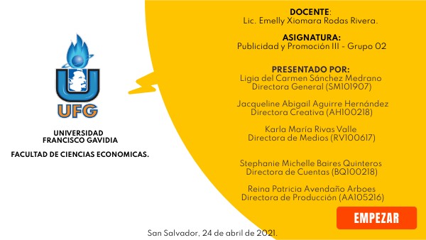 PRESENTADO POR: Ligia del Carmen Sánchez Medrano Directora General (SM101907) Jacqueline Abigail Aguirre Hernández Directora Creativa (AH100218) Karla María Rivas Valle Directora de Medios (RV100617) Stephanie Michelle Baires Quinteros Directora de Cuentas (BQ100218) Reina Patricia Avendaño Arboes Directora de Producción (AA105216)
