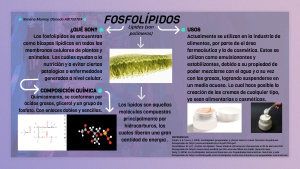 Durán, S. & Torres, J. (2015). Fosfolípidos: propiedades y efectos sobre la salud. Nutrición Hospitalaria. Recuperado de: http://www.aulamedica.es/nh/pdf/7961.pdfGreenWood, M. (s.f). ¿Cuáles son lípidos?. News Medical Life Sciences. Recuperado el 20 de abril del 2021. Recuperado de: https://www.news-medical.net/life-sciences/What-are-Lipids-(Spanish).aspx Nuty, V. (2016). Los Fosfolípidos Sustancias Naturales con Propiedades Nutraceúticas. Nutrición y vida. Recuperado de: http://nutricionyvida.cl/los-fosfolipidos-sustancias-naturales-con-propiedades-nutraceuticas/