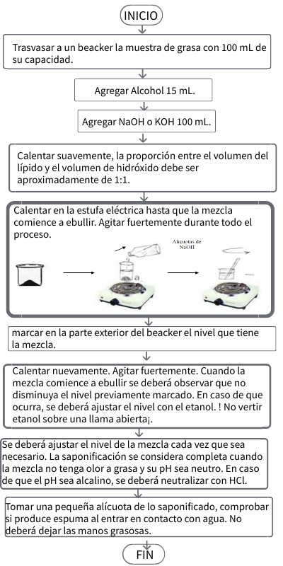 Calentar suavemente, la proporción entre el volumen del lípido y el volumen de hidróxido debe ser aproximadamente de 1:1.