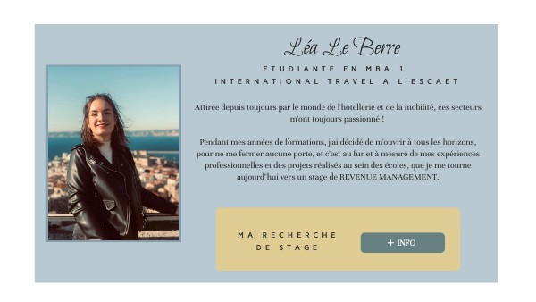 Attirée depuis toujours par le monde de l'hôtellerie et de la mobilité, ces secteurs m'ont toujours passionné ! Pendant mes années de formations, j'ai décidé de m'ouvrir à tous les horizons, pour ne me fermer aucune porte, et c'est au fur et à mesure de mes expériences professionnelles et des projets réalisés au sein des écoles, que je me tourne aujourd''hui vers un stage de REVENUE MANAGEMENT.