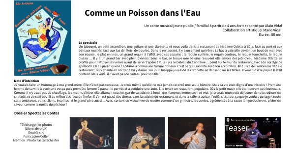 Le spectacle Un tabouret, un petit accordéon, une guitare et une clarinette et nous voilà dans le restaurant de Madame Odette à Sète, face au port et aux bateaux rouillés, face aux tas de filets, de bouées. Dans le restaurant, il y a un enfant qui rêve : Le bac à vaisselle devient un bout de mer avec son écume, le plat en inox, un grand requin à l’affût avec ses copains : le requin cuillère, le requin couteau, le requin fourchette, le requin ciseau … Il y a un grand bar avec plein d’éviers. Sous le bar, se trouve une baleine. Souvent elle envoie des jets d’eau. Madame Odette en profite pour nettoyer les verres avant de servir l’apéro ! Puis il y a le bateau du Capitaine… peint sur le mur du restaurant avec son cortège de goélands. Eh ! Il paraît que le Capitaine a connu une femme poisson. C’est ce qu’il raconte avec son accordéon. Ah ! Il y a de l’ambiance dans le restaurant : on y chante en occitan ! On y danse : un jour Joseppe jouait de la clarinette en dansant sur les tables. Il venait d’être papa ! Il était content. Mais voilà, il n’avait pas de cadeau pour son fils…