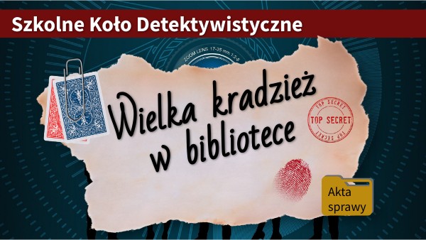 Dnia 23.04.2021 o godzinie 10 rano, szkolna bibliotekarka pani Gabriela wykonując cotygodniowy przegląd cennych dzieł bibliotecznych dokonała strasznego odkrycia – zaginęły wszystkie powieści detektywistyczne autorstwa Ziemowita Mroczysławskiego, najpopularniejsze pozycje biblioteczne wśród uczniów. Wszyscy zabrali się szybko do poszukiwań, ale okazało się, że złodziej postawnowił zabawić się w zgadyawnki. Zostwił wskazówki potrzebne do odkrycia miejsca ukrycia cennych książek. Młodzi detektywi ze Szkolnego Koła Detektywistycznego przybywajcie na ratunek!