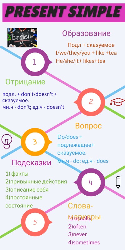 1) факты2)привычные действия 3)описание себя 4)постоянные состояние