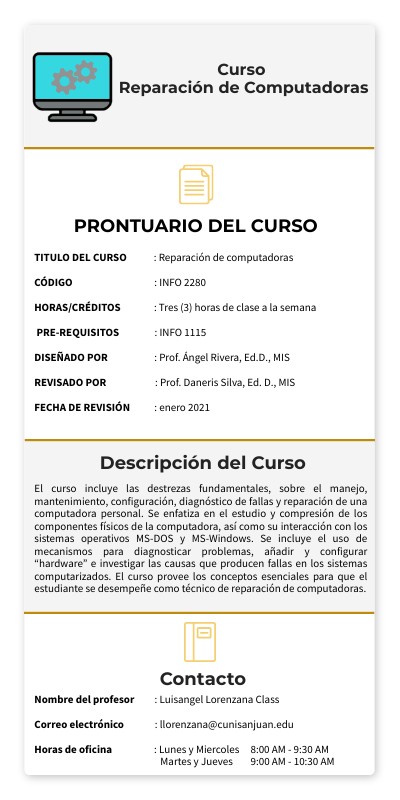 TITULO DEL CURSO : Reparación de computadoras CÓDIGO : INFO 2280 HORAS/CRÉDITOS : Tres (3) horas de clase a la semana PRE-REQUISITOS : INFO 1115 DISEÑADO POR : Prof. Ángel Rivera, Ed.D., MIS REVISADO POR : Prof. Daneris Silva, Ed. D., MIS FECHA DE REVISIÓN : enero 2021