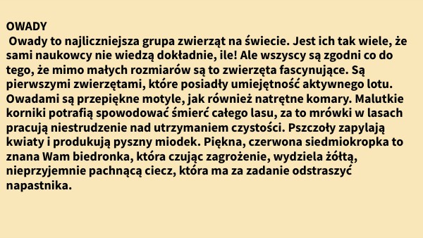 OWADY Owady to najliczniejsza grupa zwierząt na świecie. Jest ich tak wiele, że sami naukowcy nie wiedzą dokładnie, ile! Ale wszyscy są zgodni co do tego, że mimo małych rozmiarów są to zwierzęta fascynujące. Są pierwszymi zwierzętami, które posiadły umiejętność aktywnego lotu. Owadami są przepiękne motyle, jak również natrętne komary. Malutkie korniki potrafią spowodować śmierć całego lasu, za to mrówki w lasach pracują niestrudzenie nad utrzymaniem czystości. Pszczoły zapylają kwiaty i produkują pyszny miodek. Piękna, czerwona siedmiokropka to znana Wam biedronka, która czując zagrożenie, wydziela żółtą, nieprzyjemnie pachnącą ciecz, która ma za zadanie odstraszyć napastnika.