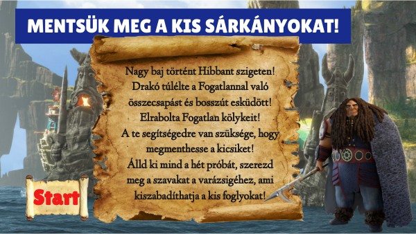 Nagy baj történt Hibbant szigeten!Drakó túlélte a Fogatlannal való összecsapást és bosszút esküdött! Elrabolta Fogatlan kölykeit! A te segítségedre van szüksége, hogy megmenthesse a kicsiket! Álld ki mind a hét próbát, szerezd meg a szavakat a varázsigéhez, ami kiszabadíthatja a kis foglyokat!