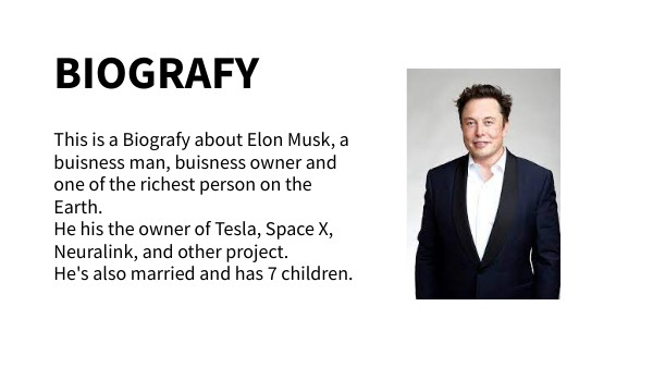This is a Biografy about Elon Musk, a buisness man, buisness owner and one of the richest person on the Earth. He his the owner of Tesla, Space X, Neuralink, and other project. He's also engaged and has had 7 children.