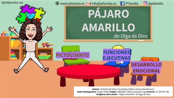 Autora: Yolanda del Amor Fernández (https://www.ptlandia.es/) Autor pictogramas: Sergio Palao Origen: ARASAAC (http://arasaac.org) Licencia: CC (BY-NC-SA) Imágenes del cuento: “Pájaro Amarillo” de Olga de Dios