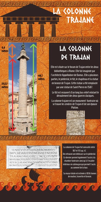 La colonne de Trajan fut consruite entre 107 et 113 ap. J-COn retrouve une dédicace sur le piédestal. Ce dernier permet également l'accès à la chambre funéraire ainsi qu'à l'escalier intérieur en colimaçon qui permet l'accès au sommet de la tour.