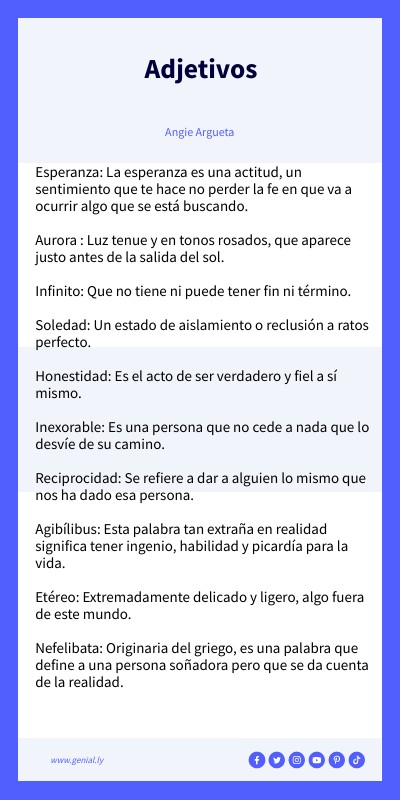 Esperanza: La esperanza es una actitud, un sentimiento que te hace no perder la fe en que va a ocurrir algo que se está buscando. Aurora : Luz tenue y en tonos rosados, que aparece justo antes de la salida del sol. Infinito: Que no tiene ni puede tener fin ni término. Soledad: Un estado de aislamiento o reclusión a ratos perfecto. Honestidad: Es el acto de ser verdadero y fiel a sí mismo. Inexorable: Es una persona que no cede a nada que lo desvíe de su camino. Reciprocidad: Se refiere a dar a alguien lo mismo que nos ha dado esa persona. Agibílibus: Esta palabra tan extraña en realidad significa tener ingenio, habilidad y picardía para la vida. Etéreo: Extremadamente delicado y ligero, algo fuera de este mundo. Nefelibata: Originaria del griego, es una palabra que define a una persona soñadora pero que se da cuenta de la realidad.