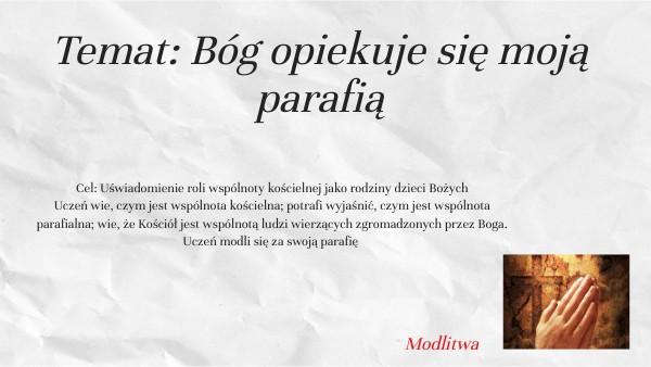 Cel: Uświadomienie roli wspólnoty kościelnej jako rodziny dzieci BożychUczeń wie, czym jest wspólnota kościelna; potrafi wyjaśnić, czym jest wspólnota parafialna; wie, że Kościół jest wspólnotą ludzi wierzących zgromadzonych przez Boga. Uczeń modli się za swoją parafię