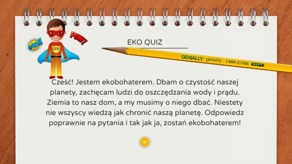 Cześć! Jestem ekobohaterem. Dbam o czystość naszej planety, zachęcam ludzi do oszczędzania wody i prądu. Ziemia to nasz dom, a my musimy o niego dbać. Niestety nie wszyscy wiedzą jak chronić naszą planetę. Odpowiedz poprawnie na pytania i tak jak ja, zostań ekobohaterem!