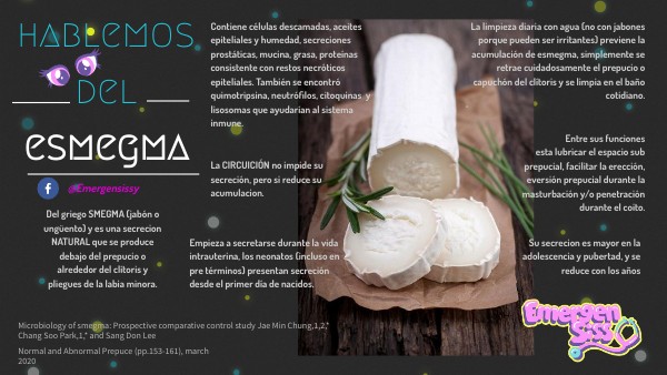 Del griego SMEGMA (jabón o ungüento) y es una secrecion NATURAL que se produce debajo del prepucio o alrededor del clítoris y pliegues de la labia minora.
