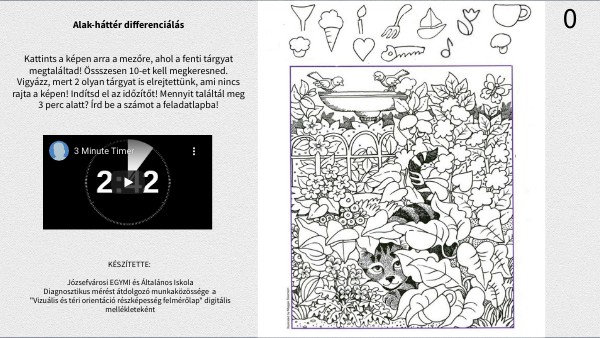 Alak-háttér differenciálás Kattints a képen arra a mezőre, ahol a fenti tárgyat megtaláltad! Össszesen 10-et kell megkeresned. Vigyázz, mert 2 olyan tárgyat is elrejtettünk, ami nincs rajta a képen! Indítsd el az időzítőt! Mennyit találtál meg 3 perc alatt? Írd be a számot a feladatlapba!