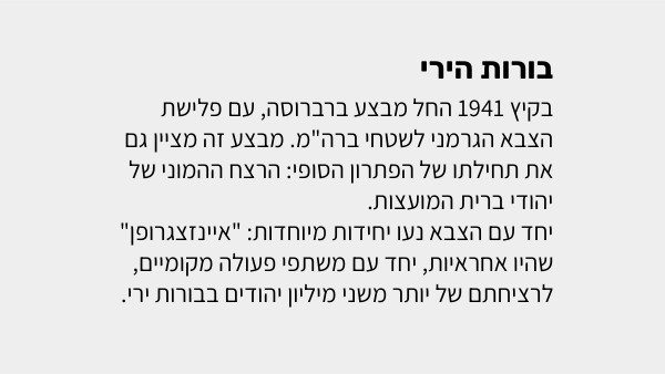 בקיץ 1941 החל מבצע ברברוסה, עם פלישת הצבא הגרמני לשטחי ברה"מ. מבצע זה מציין גם את תחילתו של הפתרון הסופי: הרצח ההמוני של יהודי ברית המועצות. יחד עם הצבא נעו יחידות מיוחדות: "איינזצגרופן" שהיו אחראיות, יחד עם משתפי פעולה מקומיים, לרציחתם של יותר משני מיליון יהודים בבורות ירי.