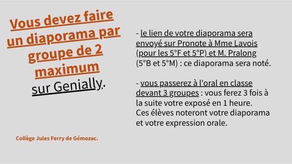 - le lien de votre diaporama sera envoyé sur Pronote à Mme Lavois (pour les 5°F et 5°P) et M. Pralong (5°B et 5°M) : ce diaporama sera noté. - vous passerez à l'oral en classe devant 3 groupes : vous ferez 3 fois à la suite votre exposé en 1 heure. Ces élèves noteront votre diaporama et votre expression orale.