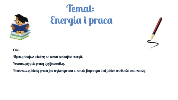 Cele:Uporządkujesz wiedzę na temat rodzajów energii. Poznasz pojęcie pracy i jej jednostkę. Dowiesz się, kiedy praca jest wykonywana w sensie fizycznym i od jakich wielkości ona zależy.