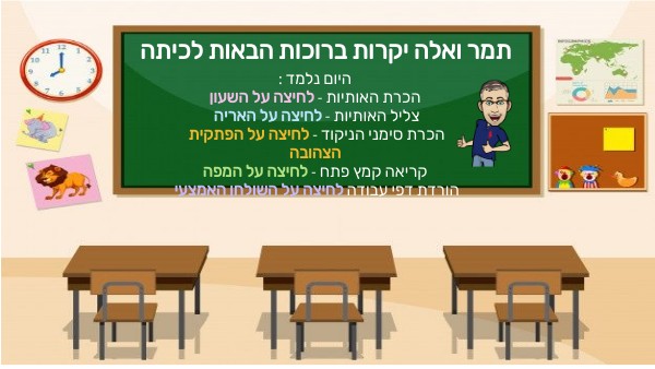 : היום נלמד הכרת האותיות - לחיצה על השעון צליל האותיות - לחיצה על האריה הכרת סימני הניקוד - לחיצה על הפתקית הצהובה הורדת דפי עבודה לחיצה על השולחן האמצעי