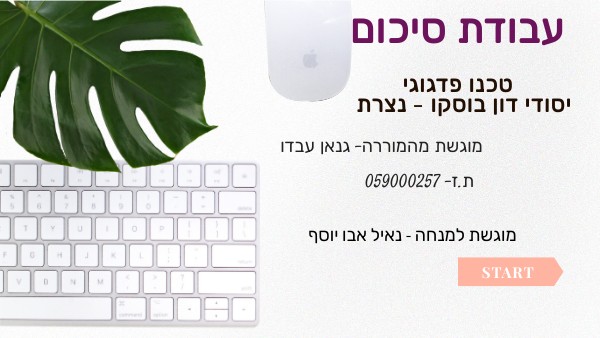 לסיכום, נהניתי מאוד מהשתתפותי בקורס ואני בעד הלימוד המתוקשב כי הרגשתי שהוא נוח ולא שגרתי , אנו חופשיים בדרך או אחרת . אני מצפה ללמד את התלמידים שלי באמצעות הכלים האלה וגם כלים שונים.כי שילוב הטכנולוגיה והמחשב הוא דבר חיוני בימים האלה, וכל מורה צריך לדאוג להשתמש במחשב בשיעורים שלו.