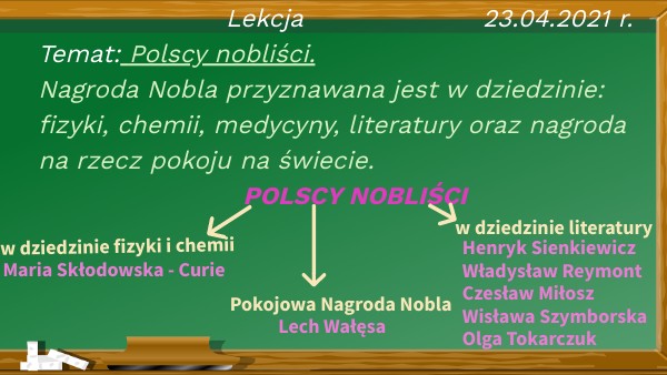 Lekcja 23.04.2021 r.Temat: Polscy nobliści. Nagroda Nobla przyznawana jest w dziedzinie: fizyki, chemii, medycyny, literatury oraz nagroda na rzecz pokoju na świecie. POLSCY NOBLIŚCI