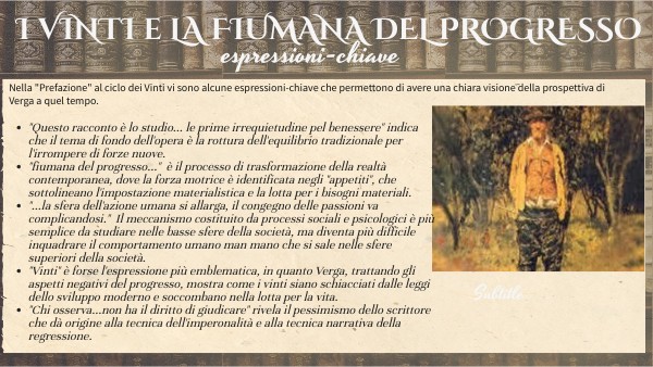 - "Vinti" è forse l'espressione più emblematica, in quanto Verga, trattando gli aspetti negativi del progresso, mostra come i vinti siano schiacciati dalle leggi dello sviluppo moderno e soccombano nella lotta per la vita.