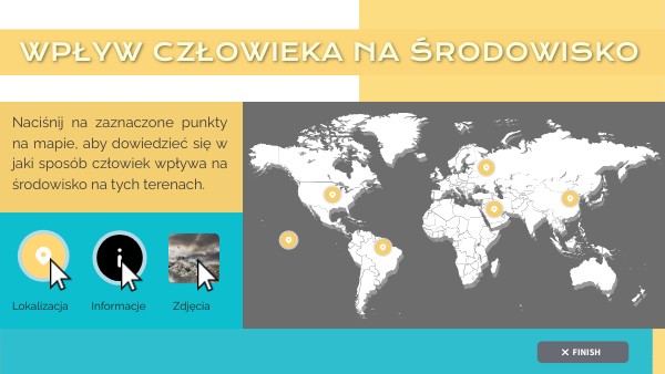 Naciśnij na zaznaczone punkty na mapie, aby dowiedzieć się w jaki sposób człowiek wpływa na środowisko na tych terenach.