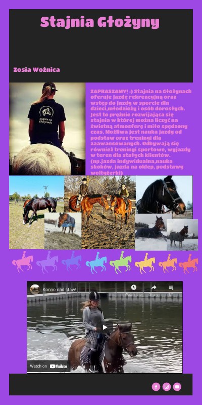 ZAPRASZAMY! :) Stajnia na Głożynach oferuje jazdę rekreacyjną oraz wstęp do jazdy w sporcie dla dzieci,młodzieży i osób dorosłych. Jest to prężnie rozwijająca się stajnia w której można liczyć na świetną atmosferę i miło spędzony czas. Możliwa jest nauka jazdy od podstaw oraz treningi dla zaawansowanych. Odbywają się również treningi sportowe, wyjazdy w teren dla stałych klientów. (np.jazda indywidualna,nauka skoków, jazda na oklep, podstawy woltyżerki)