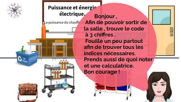 Bonjour , Afin de pouvoir sortir de la salle , trouve le code à 3 chiffres . Fouille un peu partout afin de trouver tous les indices nécessaires. Prends aussi de quoi noter et une calculatrice. Bon courage !