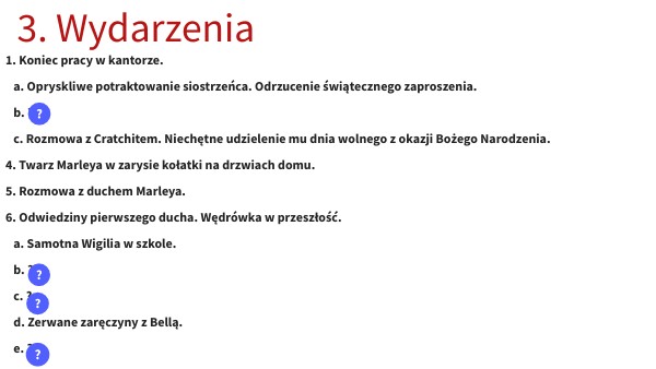 9. Odwiedziny drugiego ducha. Obrazy tegorocznych Świąt. a. ? b. ? c. ?10. Odwiedziny trzeciego ducha. Wędrówka w przyszłość. a. ? b. ? c. ? d. ? e. ?