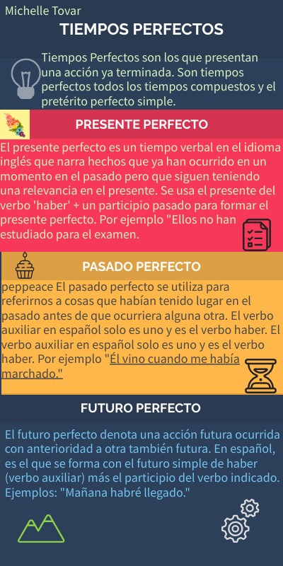 Tiempos Perfectos son los que presentan una acción ya terminada. Son tiempos perfectos todos los tiempos compuestos y el pretérito perfecto simple.