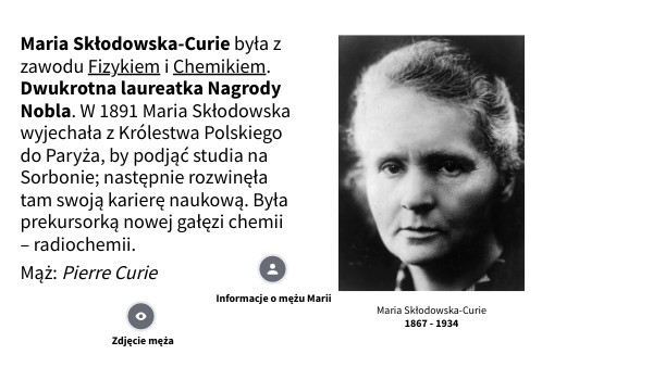 Maria Skłodowska-Curie była z zawodu Fizykiem i Chemikiem.Dwukrotna laureatka Nagrody Nobla. W 1891 Maria Skłodowska wyjechała z Królestwa Polskiego do Paryża, by podjąć studia na Sorbonie; następnie rozwinęła tam swoją karierę naukową. Była prekursorką nowej gałęzi chemii – radiochemii.
