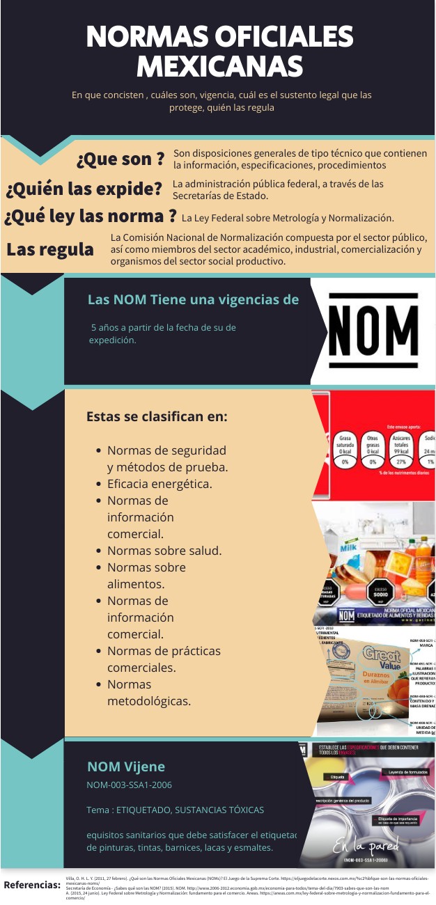 Villa, O. H. L. Y. (2011, 27 febrero). ¿Qué son las Normas Oficiales Mexicanas (NOMs)? El Juego de la Suprema Corte. https://eljuegodelacorte.nexos.com.mx/%c2%bfque-son-las-normas-oficiales-mexicanas-noms/ Secretaría de Economía - ¿Sabes qué son las NOM? (2015). NOM. http://www.2006-2012.economia.gob.mx/economia-para-todos/tema-del-dia/7903-sabes-que-son-las-nom A. (2015, 24 junio). Ley Federal sobre Metrología y Normalización: fundamento para el comercio. Aneas. https://aneas.com.mx/ley-federal-sobre-metrologia-y-normalizacion-fundamento-para-el-comercio/