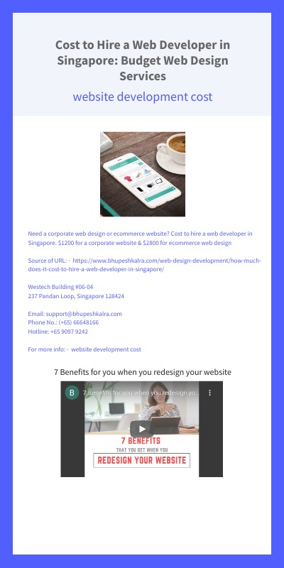 Need a corporate web design or ecommerce website? Cost to hire a web developer in Singapore. $1200 for a corporate website & $2800 for ecommerce web design Source of URL: - https://www.bhupeshkalra.com/web-design-development/how-much-does-it-cost-to-hire-a-web-developer-in-singapore/ Westech Building #06-04237 Pandan Loop, Singapore 128424Email: support@bhupeshkalra.comPhone No.: (+65) 66648166Hotline: +65 9097 9242 For more info: - website development cost