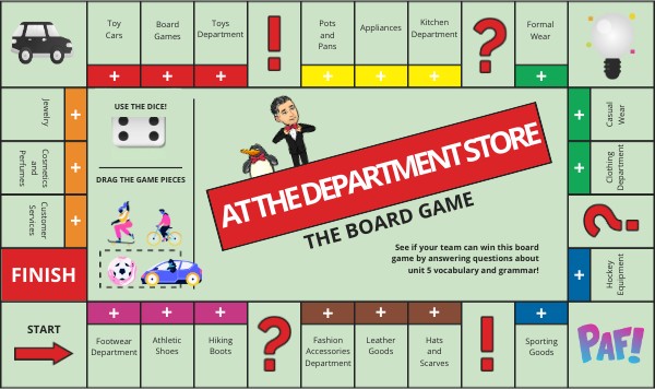 See if your team can win this board game by answering questions about unit 5 vocabulary and grammar!