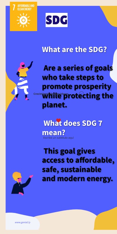 What are the SDG? Are a series of goals who take steps to promote prosperity while protecting the planet. What does SDG 7 mean? This goal gives access to affordable, safe, sustainable and modern energy.