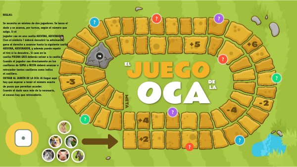 REGLAS:Se necesita un mínimo de dos jugadores. Se lanza el dado y se avanza, por turnos, según el número que salga. Si el jugador cae en una casilla ADIVINA, ADIVINADOR (Con el símbolo ? deberá descubrir la adivinanza) gana el derecho a avanzar hasta la siguiente casilla ADIVINA, ADIVINADOR, y además puede repetir el tiro si la descubre.. Si caes en la casilla PIEDRA GRIS deberás volver a la casilla 1. Cuando el jugador cae directamente en los casilleros de SUMA o RESTA deberá avanzar o retroceder tantos casilleros como indica el casillero. ENTRAR AL JARDÍN DE LA OCA: Al llegar aquí hay que esperar a tener el número exacto de pasos que permitan acceder. Cuando el dado saca más de lo necesario, el exceso hay que retrocederlo.