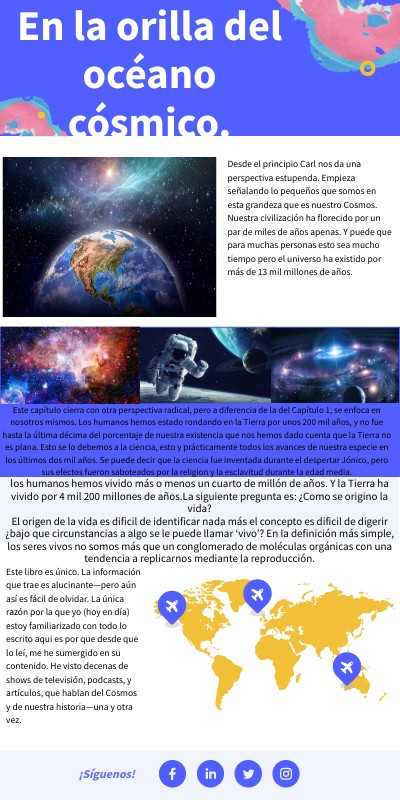 Este libro es único. La información que trae es alucinante—pero aún así es fácil de olvidar. La única razón por la que yo (hoy en día) estoy familiarizado con todo lo escrito aqui es por que desde que lo leí, me he sumergido en su contenido. He visto decenas de shows de televisión, podcasts, y artículos, que hablan del Cosmos y de nuestra historia—una y otra vez.