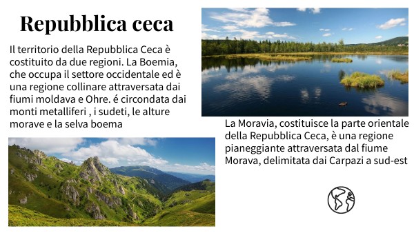 Il territorio della Repubblica Ceca è costituito da due regioni. La Boemia, che occupa il settore occidentale ed è una regione collinare attraversata dai fiumi moldava e Ohre. è circondata dai monti metalliferi , i sudeti, le alture morave e la selva boema
