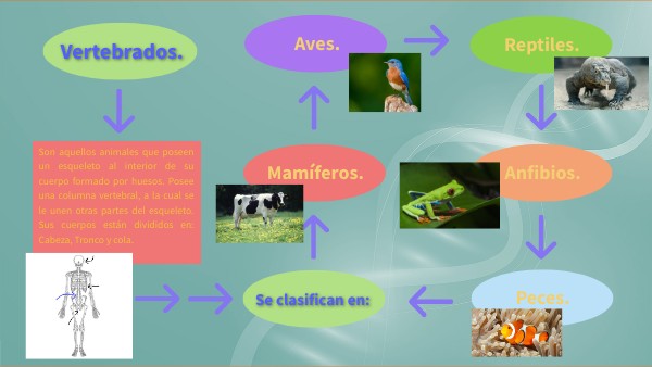 Son aquellos animales que poseen un esqueleto al interior de su cuerpo formado por huesos. Posee una columna vertebral, a la cual se le unen otras partes del esqueleto. Sus cuerpos están divididos en: Cabeza, Tronco y cola.
