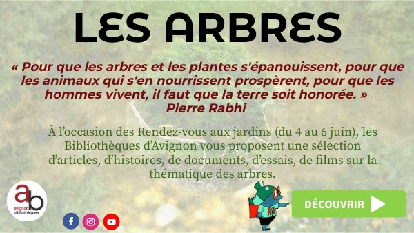 À l’occasion des Rendez-vous aux jardins (du 4 au 6 juin), les Bibliothèques d’Avignon vous proposent une sélection d’articles, d’histoires, de documents, d’essais, de films sur la thématique des arbres.