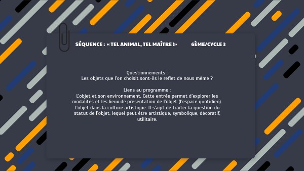 Questionnements : Les objets que l’on choisit sont-ils le reflet de nous même ? Liens au programme : L’objet et son environnement. Cette entrée permet d’explorer les modalités et les lieux de présentation de l’objet (l’espace quotidien). L’objet dans la culture artistique. Il s’agit de traiter la question du statut de l’objet, lequel peut être artistique, symbolique, décoratif, utilitaire.
