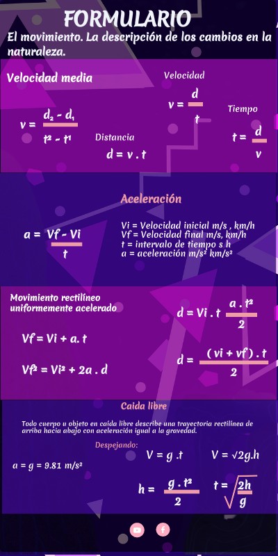 Vi = Velocidad inicial m/s , km/h Vf = Velocidad final m/s, km/h t = intervalo de tiempo s h a = aceleración m/s² km/s²