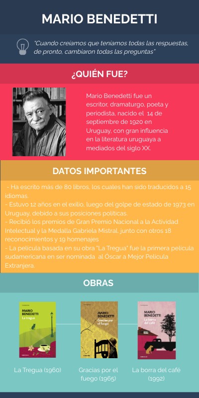 Mario Benedetti fue un escritor, dramaturgo, poeta y periodista, nacido el 14 de septiembre de 1920 en Uruguay, con gran influencia en la literatura uruguaya a mediados del siglo XX.