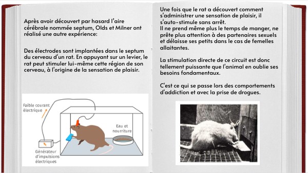 Des électrodes sont implantées dans le septum du cerveau d'un rat. En appuyant sur un levier, le rat peut stimuler lui-même cette région de son cerveau, à l'origine de la sensation de plaisir.