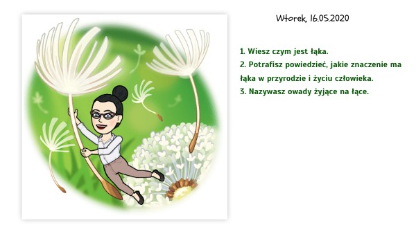 1. Wiesz czym jest łąka. 2. Potrafisz powiedzieć, jakie znaczenie ma łąka w przyrodzie i życiu człowieka. 3. Nazywasz owady żyjące na łące.