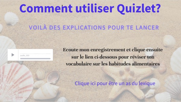 Ecoute mon enregistrement et clique ensuite sur le lien ci-dessous pour réviser ton vocabulaire sur les habitudes alimentaires