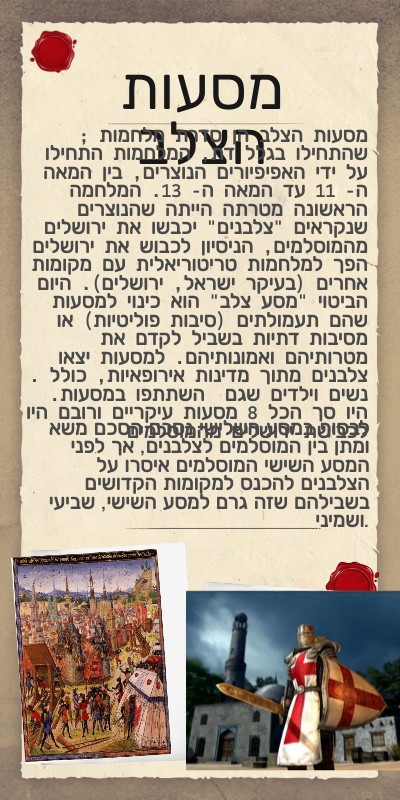 ; מסעות הצלב הן סדרת מלחמות שהתחילו בגלל דת, המלחמות התחילו על ידי האפיפיורים הנוצרים, בין המאה ה- 11 עד המאה ה- 13. המלחמה הראשונה מטרתה הייתה שהנוצרים שנקראים "צלבנים" יכבשו את ירושלים מהמוסלמים, הניסיון לכבוש את ירושלים הפך למלחמות טריטוריאלית עם מקומות אחרים (בעיקר ישראל, ירושלים). היום הביטוי "מסע צלב" הוא כינוי למסעות שהם תעמולתים (סיבות פוליטיות) או מסיבות דתיות בשביל לקדם את מטרותיהם ואמונותיהם. למסעות יצאו צלבנים מתוך מדינות אירופאיות, כולל . נשים וילדים שגם השתתפו במסעות. היו סך הכל 8 מסעות עיקריים ורובם היו לכבישת ירושלים מהמוסלמים