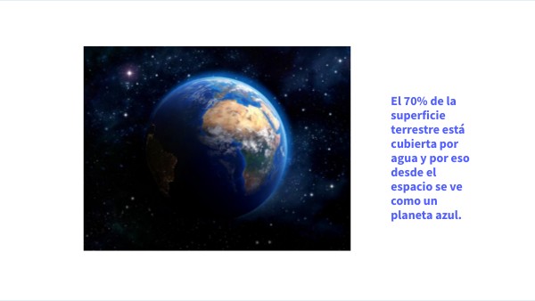 El 70% de la superficie terrestre está cubierta por agua y por eso desde el espacio se ve como un planeta azul.